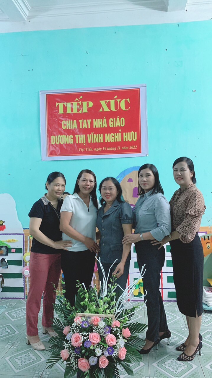 Chiều ngày 19/11/2022, Trường mầm non Việt Tiến tổ chức buổi chia tay cô Dương Thị Vĩnh nghỉ hưu theo chế độ của Nhà nước. Buổi chia tay cũng là sự ghi nhận, cảm ơn đối với cô giáo đã cống hiến cả cuộc đời mình cho sự nghiệp xây dựng và trưởng thành của mái trường Màm non Việt Tiến.