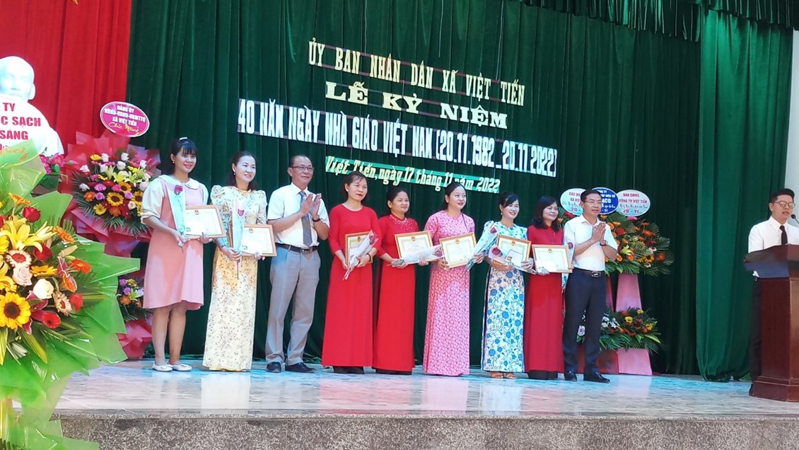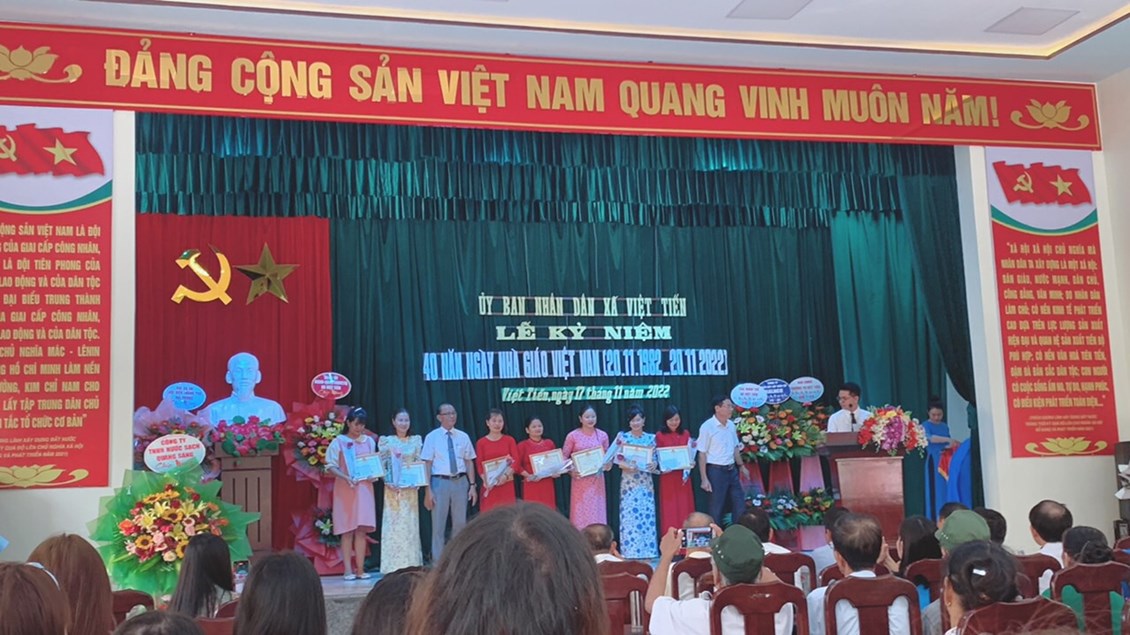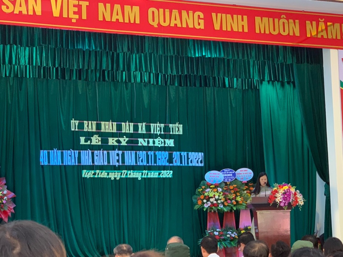 Hòa chung không khí cả nước chào mừng ngày Nhà giáo Việt Nam 20/11, sáng ngày 17/11/2022 Uỷ ban nhân dân xã Việt Tiến đã long trọng tổ chức buổi “Lễ kỉ niệm 40 năm ngày Nhà giáo Việt Nam 20/11/1982-20/11/2022” trong không khí tràn ngập sắc màu của hoa tươi và đầy cảm xúc của các cán bộ, giáo viên, nhân viên 3 cấp học Mầm non, Tiểu học, THCS. Đây là hoạt động thường niên của xã nhà nhằm tôn vinh, thể hiện tình cảm biết ơn, kính trọng với các thầy giáo, cô giáo đang tham gia giảng dạy tại địa phương.